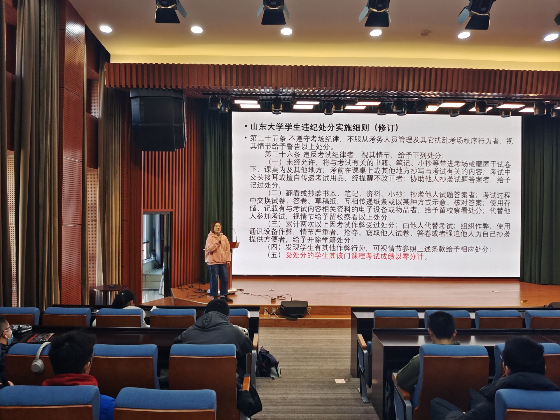 会议宣读了《山东大学学生违纪处分实施细则》中关于考试作弊相关条例,结合考试违纪处分具体案例,强调了诚信考试的必要性和重要性。要求同学们要树立底线意识,遵守考试纪律,坚决做到不作弊,考出自己真实的水平。会上,学院本科生辅导员赵悦提醒大家,临近期末,各位同学要保持良好心情,把主要经历集中到期末复习中,全力以赴做好期末考试准备。同时提醒同学们要注意心理健康,加强体育锻炼,保持良好心情和健康体魄。