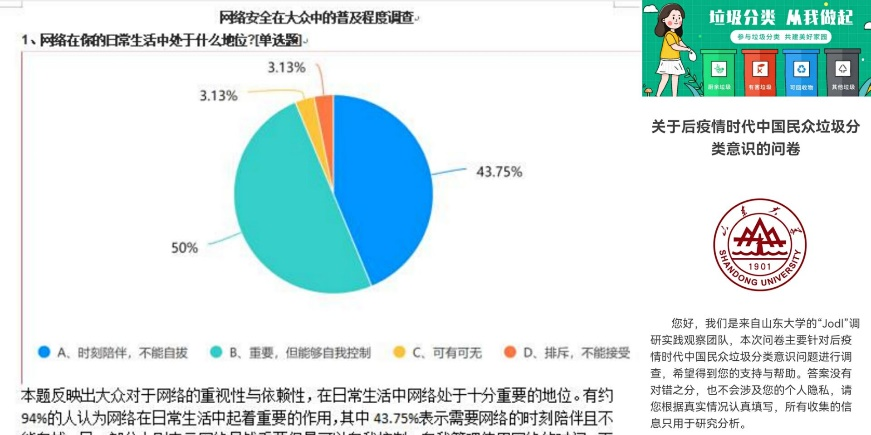 紧跟社会热点,调研寻根问源。学院维安网络调研团和“Jodl”线上调研观察团分别从“网络安全知识普及”和“后疫情时代民众垃圾分类意识”两个社会热点问题出发,以网络数据库为依据,精心设计问卷问题,从简从精,采用线上与线下并进的方式发放问卷,对收集到的百余份问卷结果进行可视化处理与数据分析,以山大视角剖析社会热点问题,把握时代脉搏。
